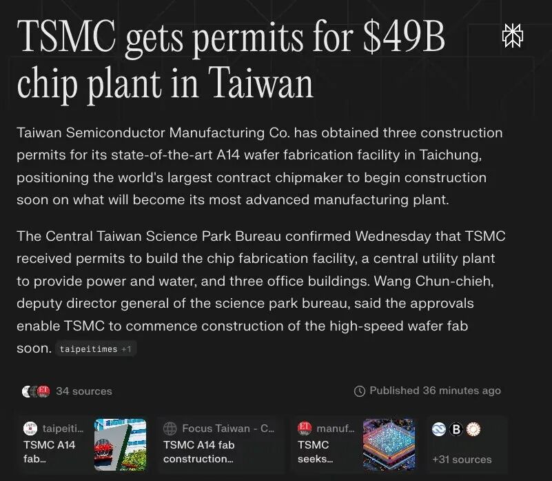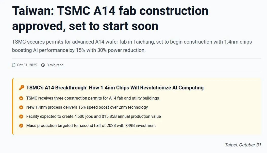 1、台积电获得A14工厂及附属设施的三张建造许可