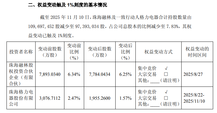 11月11日,闻泰科技(600745)(600745.SH)发布公告显示,公司持股5%以上股东珠海融林及其一致行动人格力电器(000651)(000651.SZ)合计减持公司股份1244.43万股,减持计划实施完毕。减持后,珠海融林及其一致行动人格力电器合计持有公司7.83%股份。